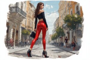 Walking through Sofia in her red wetlook leggings, Nina turns the streets into a playful runway, syncing every step with the lively Bulgarian folk tune “Go Back, Go Back, Kalina Girl.”