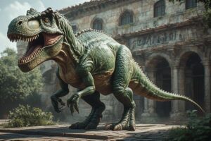 Outside a modern building, a massive dinosaur statue surprises visitors with lifelike movements head tilts, tail swishes, and claw flexes creating a mesmerizing, funny, and slightly comical spectacle that feels almost alive.