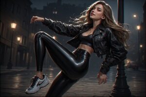 Under the glow of a streetlamp, Nina circles with pure delight in her leather jacket, black wetlook leggings, and sneakers. Every turn, every laugh, and every twirl turns quiet streets into a playful urban playground.