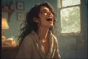 Fresh from the bath, Yo wraps herself in a cozy bathrobe, wet hair dripping, and erupts into loud, unstoppable laughter. Her joyful energy fills the room, turning a simple moment into a playful, contagious celebration of fun and happiness.